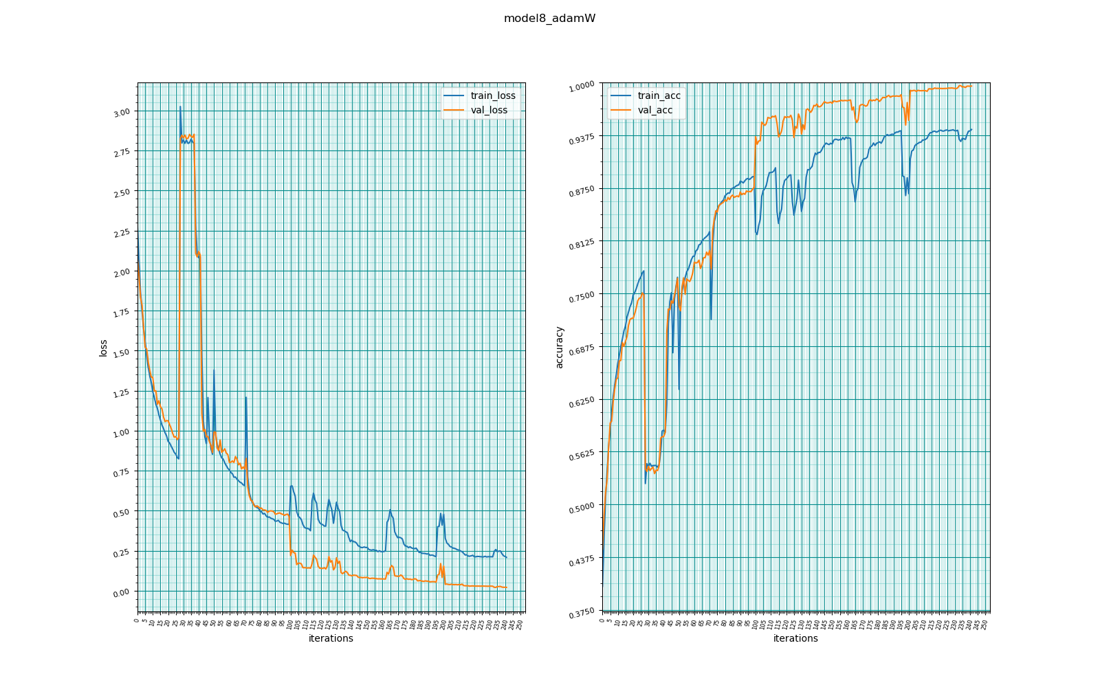 В качестве оптимизатора спользовался алгоритм AdamW, со стандартным learning rate=1e-3. Проводились эксперементы с модификацией AMSGrad, но значительных отличий выявить не получилось (тем не менее, была выбрана именно модификация AMSGrad, поскольку, согласно работам, которые приведены в документации pyTorch, она ускоряет сходимость).