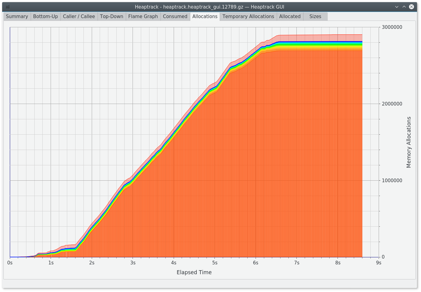 The highly recommended way to analyze a heap profile is by using the heaptrack_gui tool. It depends on Qt 5 and KF 5 to graphically visualize the recorded data. It features: