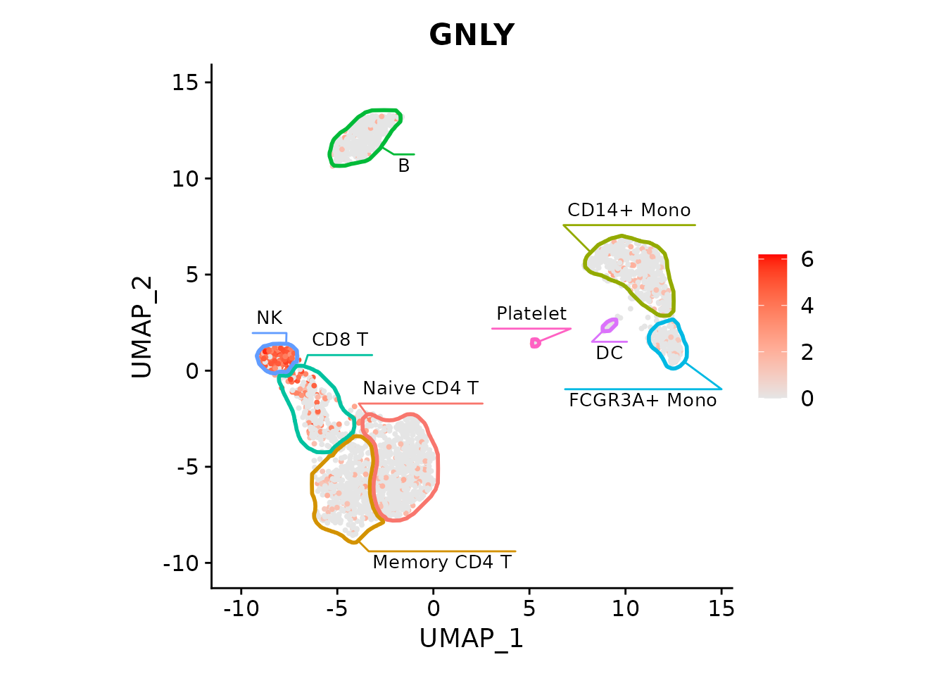 fancyMask(maskTable, linewidth=0, ratio=1)FeaturePlot with the mask and labels showing GNLY gene being specific