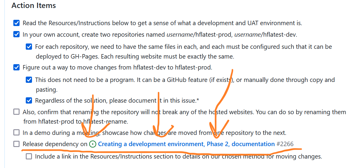 A dependency is a condition that must be fulfilled before work on an issue can begin. A dependency can take many forms, but it is often another issue. When adding dependencies to an issue, be sure to add a section called Dependency, and add the dependency as a checkbox (see below for an example). If the dependency is an issue, it is also customary to go to that issue and put "release the dependency" as an action item. For example, if #1911 is dependent upon the completion of #1823, then #1911 will have a Dependency section. On #1823, the last action item should be, "release dependency on #1911". This makes sure that there is ample follow up so issues do not become lost.
