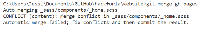 If there are any merge conflicts, you will see a warning message of "Automatic merge failed; fix conflicts and then commit the result." You will need to resolve these merge conflicts before continuing with the rest of the steps. INSERT IMAGE