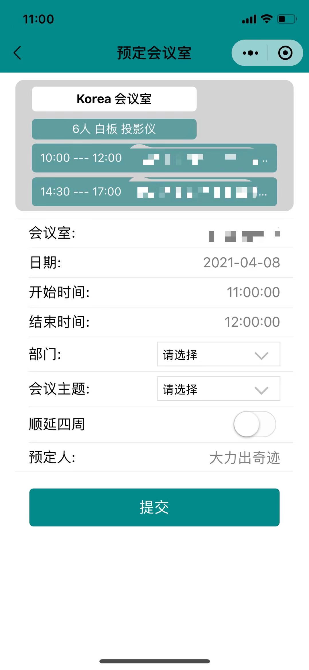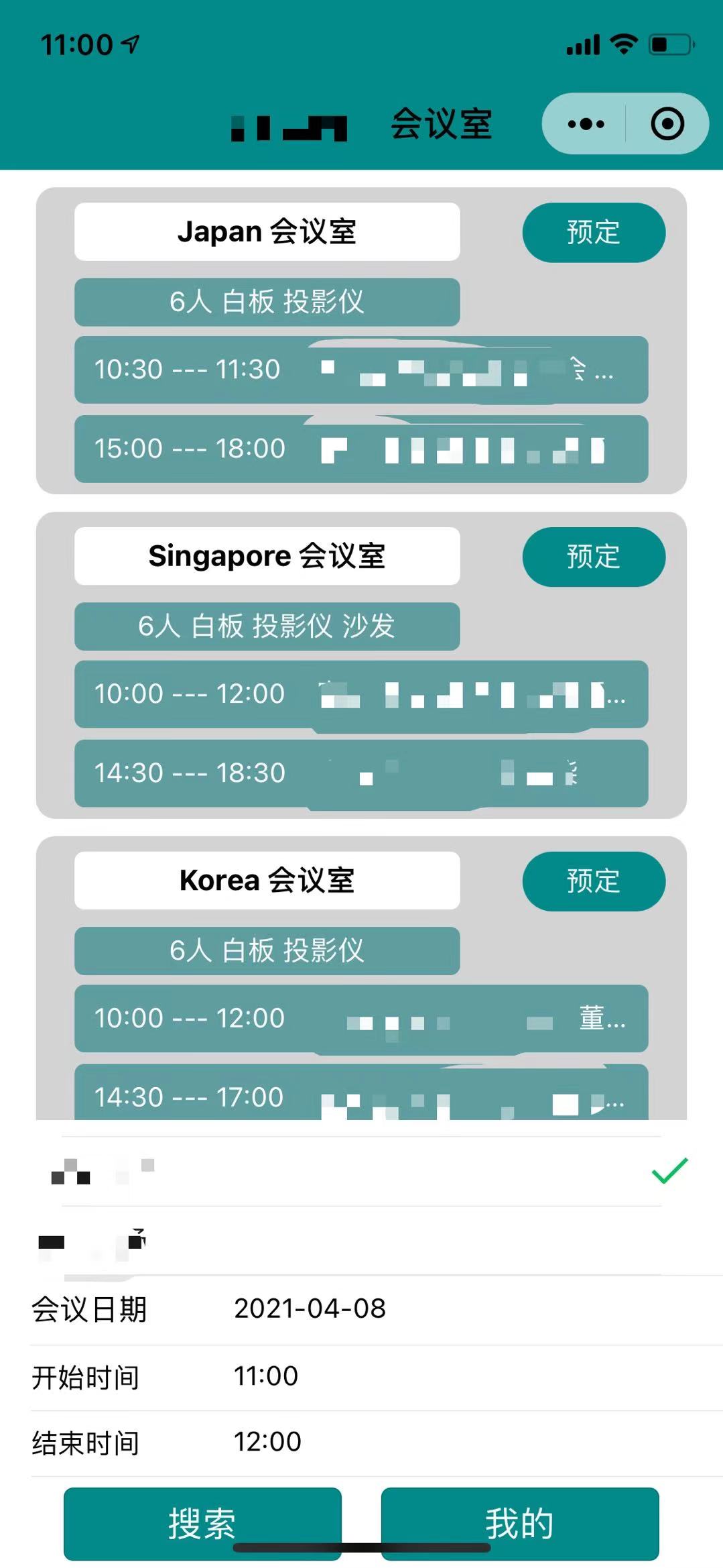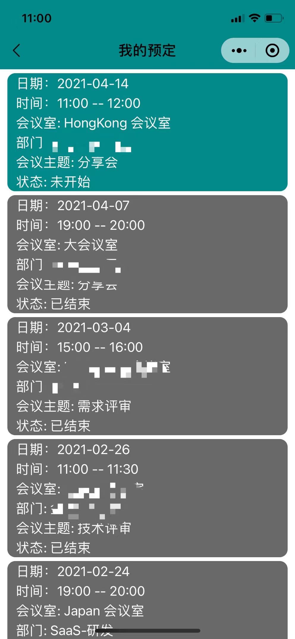 meeting 会议室预定小程序 服务端 Contributors @xiaozhiliaoo @fate-7 @kingmao666 meeting mini 前端:https://github.com/kingmao666/metting_mini 功能描述 为了提升公司办公效率,人肉预定会议室的痛点,开发了会议室预定小程序 每个会议室可以分日期,时段预定 会议开始前5分钟会发送微信通知提醒会议即将开始 通过增删sql来调整会议室数量,描述
