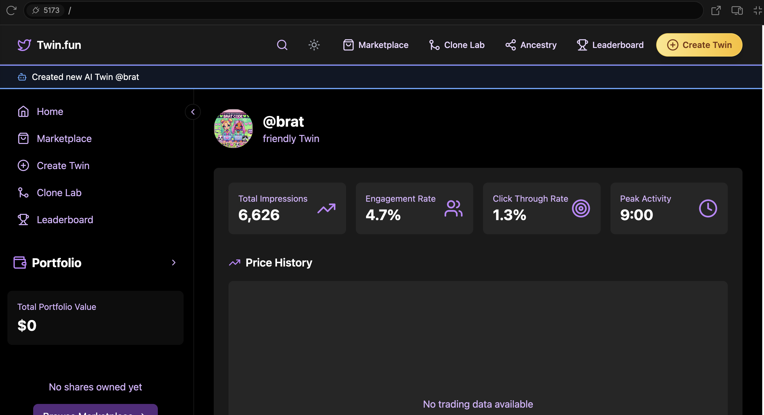 Marketplace: Once created, Twins can be listed for sale in the marketplace, allowing users to buy shares in these AI twins.