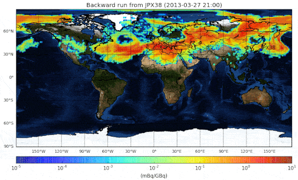 $ python quick_look.py -i ../test_data/bwd_run -t mother -m -l 0 4 -r ../test_data/receprors.txt -x "Backward run from JPX38" -u "(mBq/GBq)" -o ../samples/An animation in samples should be produced.