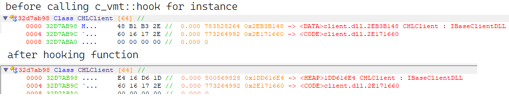 only one .data section patch is applied to original process memory. the entire original vtable is copied over to a new instance, where hooked functions are pointer-swapped.