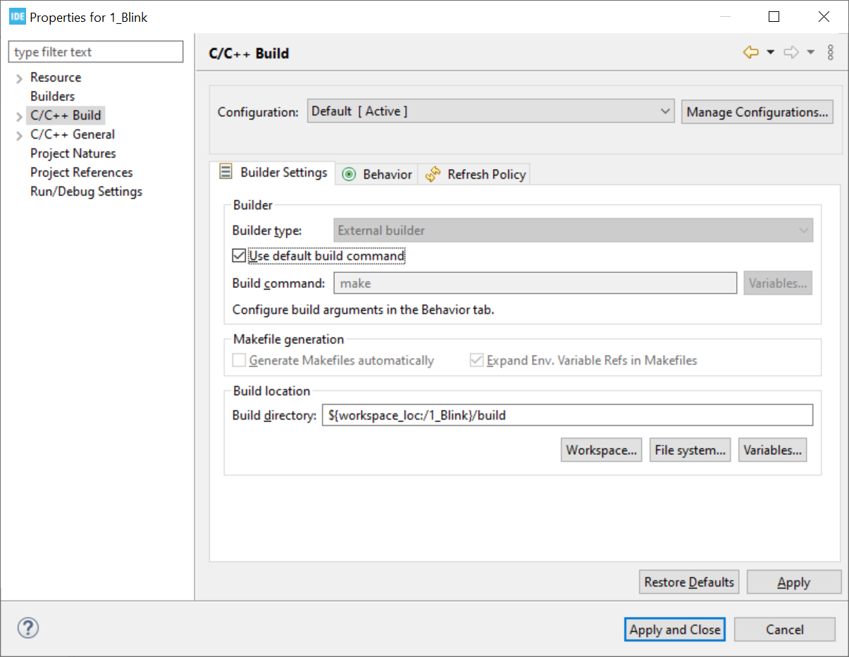 The next step is to fill in the build settings. Right click on the project, hit "Properties" (or Alt+Enter), then go to the "C/C++ build" section. Fill in the "Builder Settings" and "Behavior" tabs as follows (be sure to replace the build location with the relevant value for your project).