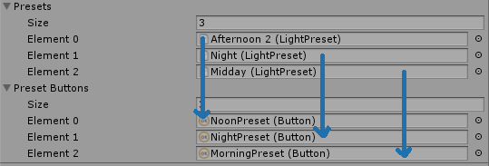 You can place a light int the get from light object field and click the "Get from light" button. That'll get all the settings from the light and store them in the preset. For each preset you'll have to create a button that makes it work, assign the button to the Preset Buttons array in a "one to one" correspondance manner. Like shown in the next image